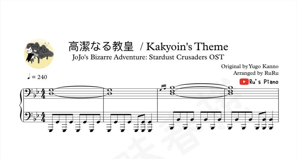 This is the Sheet Music PDF of Ru's piano cover “JoJo的奇幻冒險JoJo's Bizarre Adventure Stardust Crusaders OST - 高潔なる教皇 Kakyoin's Theme ”