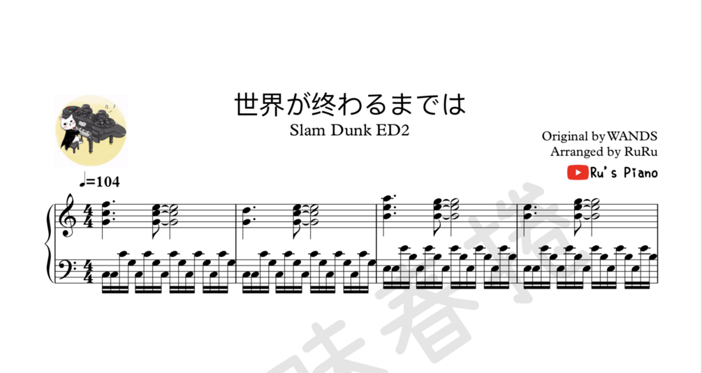 This is the Sheet Music PDF of Ru's piano cover "Slam Dunk ED2 - Sekai ga Owaru Made wa世界が终わるまでは"