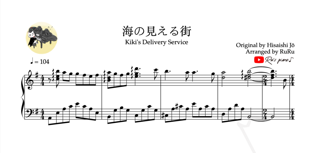 There are the Sheet Music PDF and MP3 file of Ru's piano cover “魔女宅急便Kiki's Delivery Service - 海の見える街 A Town With An Ocean View”