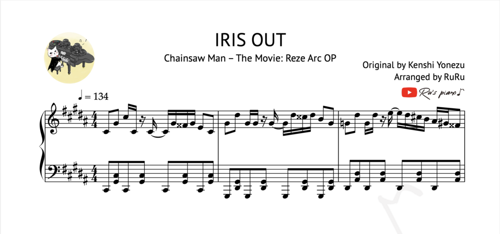 There are the Sheet Music PDF and MP3 file of Ru's piano cover "鏈鋸人Chainsaw Man – The Movie: Reze Arc OP - IRIS OUT"